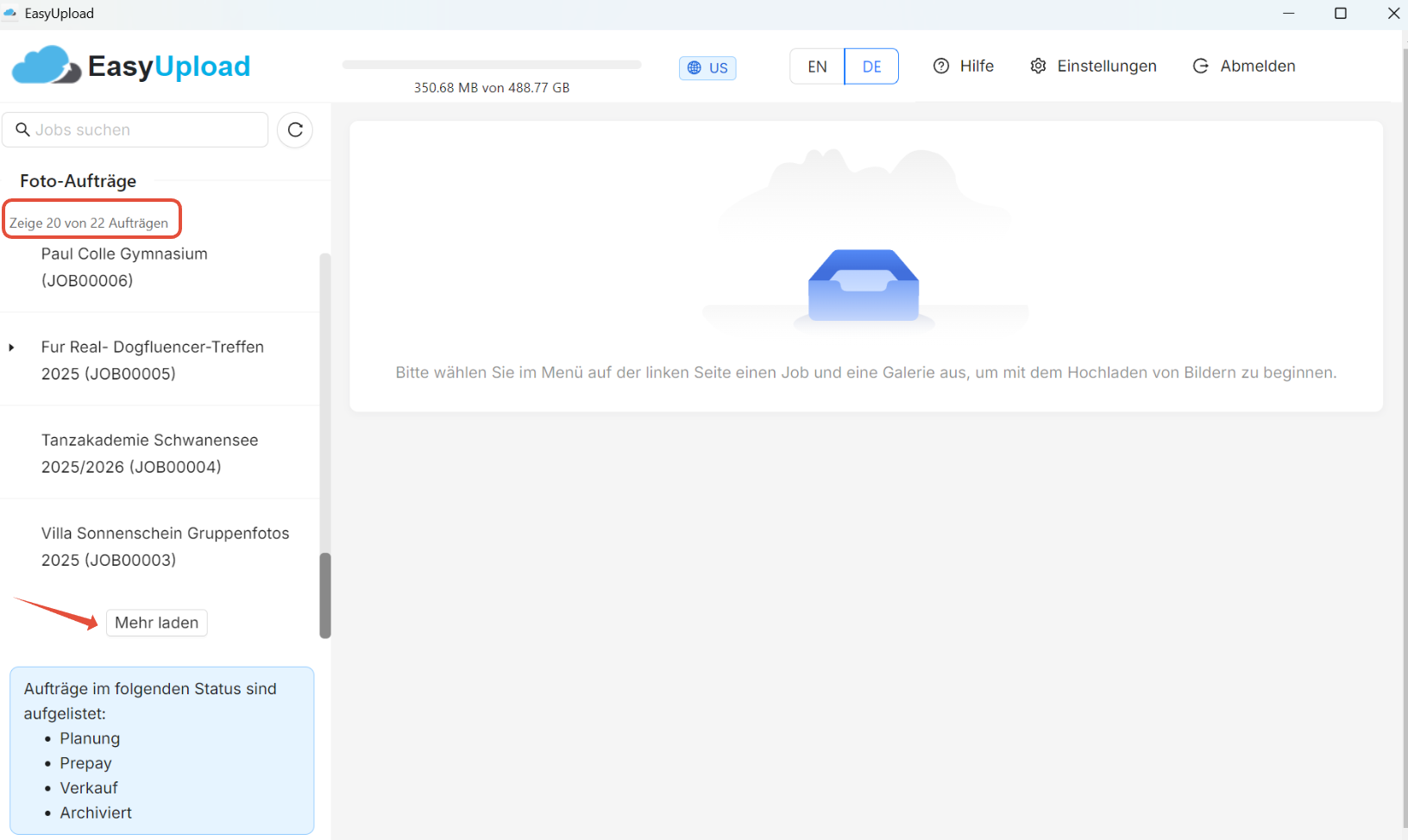 - Du kannst Fotos zu all deinen Aufträgen hochladen, unabhängig vom Status des Auftrags. In deinen EasyUpload-Einstellungen kannst du auswählen, welche Aufträge angezeigt werden sollen: Aufträge in Planung, Verkauf, Vorauszahlung (nur relevant für US- Kunden) und Archivmodus.