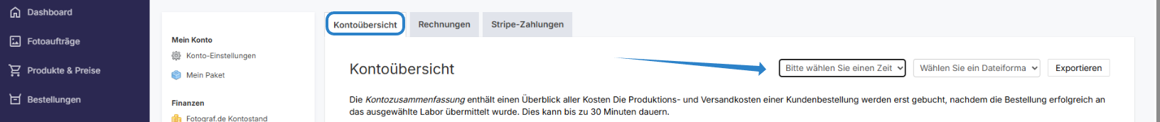 Er hilft dir, Bestellungen mit den zugehörigen Zahlungen und Gebühren abzugleichen. Du kannst entweder nach Foto-Auftrag filtern oder das gesamte Datenset herunterladen (keinen Auftrag auswählen). Der Zeitraum darf maximal 6 Monate betragen.