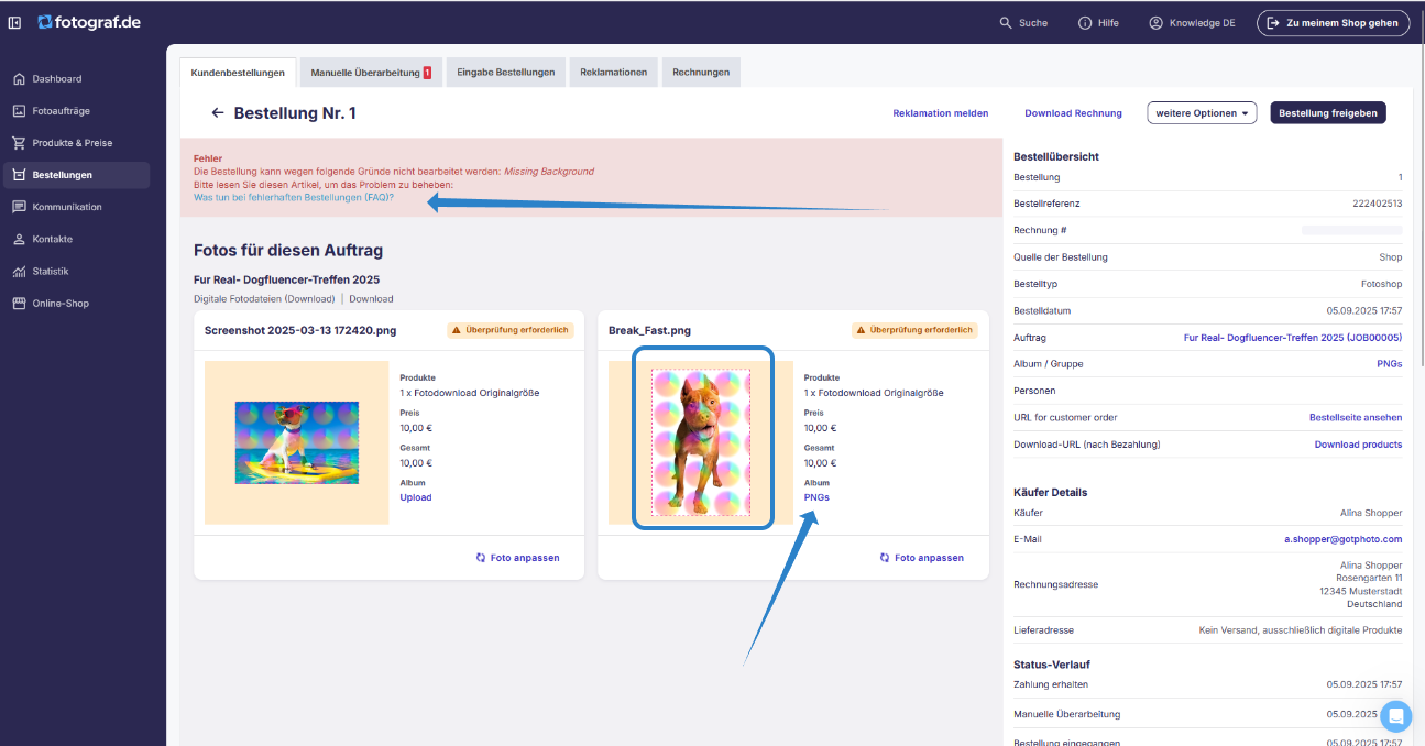 Kund:innen können sich bei dir melden, wenn sie vergessen haben, den richtigen Hintergrund auszuwählen - oder versehentlich den falschen gewählt haben.Du musst in diesem Fall das fertige Foto (PNG + Hintergrund) austauschen.