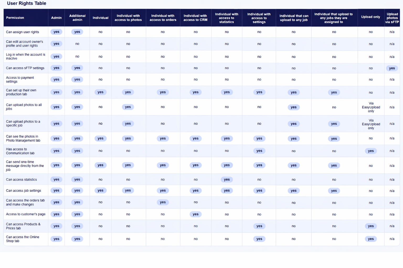 *Individual: Can access jobs/jobs assigned to. Upload photos. Create own production tab. Can access and edit job settings and advanced settings. Can't see orders and sales, can send a newsletter from the job.