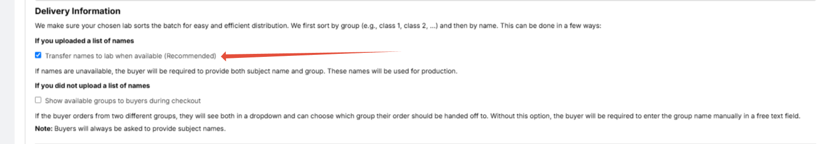 "If you uploaded a list of namesTransfer names to lab when available (Recommended)" b. Packaging for orders with multiple subjects (siblings): Select between "Combine - all ordered photo products will be delivered in one envelope." and "Keep separate - each subject will receive an envelope with their ordered photo products." - Sender Address: You can add an alternative return address if your lab allows.