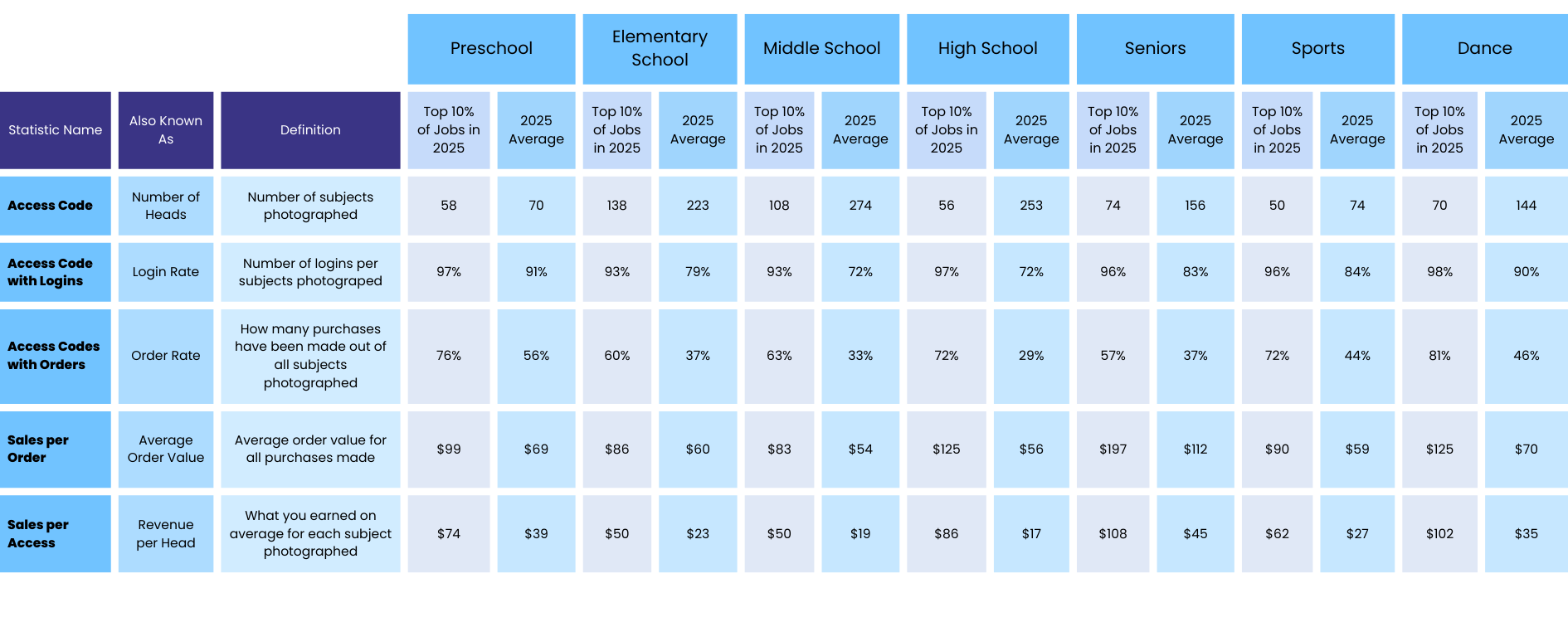 We examined key performance metrics for top-performing and average GotPhoto photographers in 2025, organized by job type. Use this as a reference to assess your own performance.