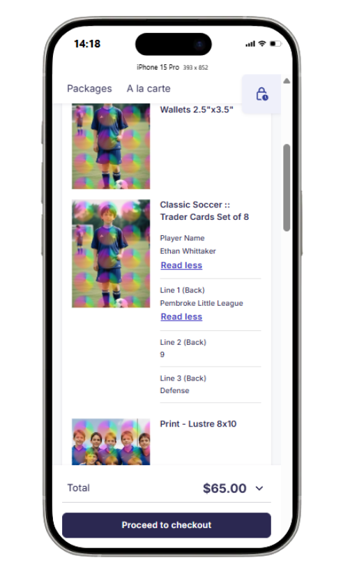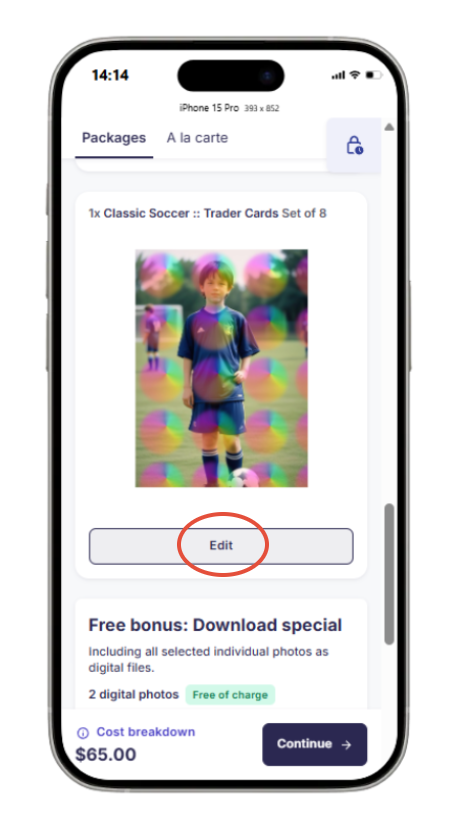 Next, within the package, your customers can scroll through the items, select their preferred pose, choose cropping and background options for each product via the "Edit" button. When they reach a customizable item, they click “Edit” just like they did for the previous items.