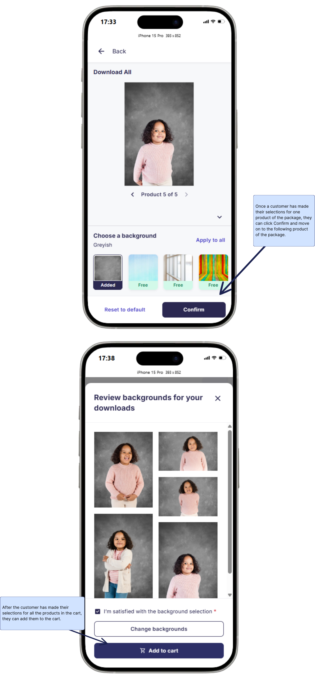 Download all (PNGs): Customers selecting the “Download All” package can choose backgrounds for the first 20 images, then continue for the rest.