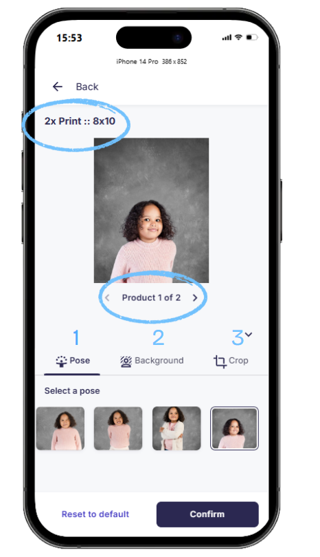 After selecting all poses/backgrounds and reviewing the crop, customers can add downloads (if offered), next, they click Add to cart.