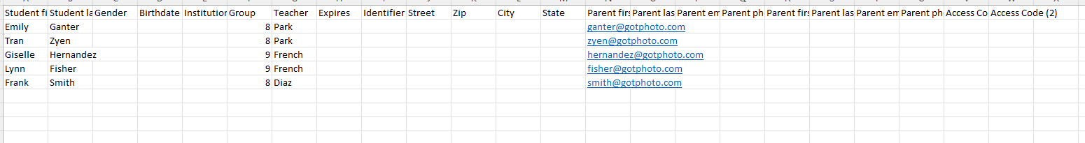 - For a school job: Enter the grade information in the group column, and the teacher or homeroom information in the teacher column.