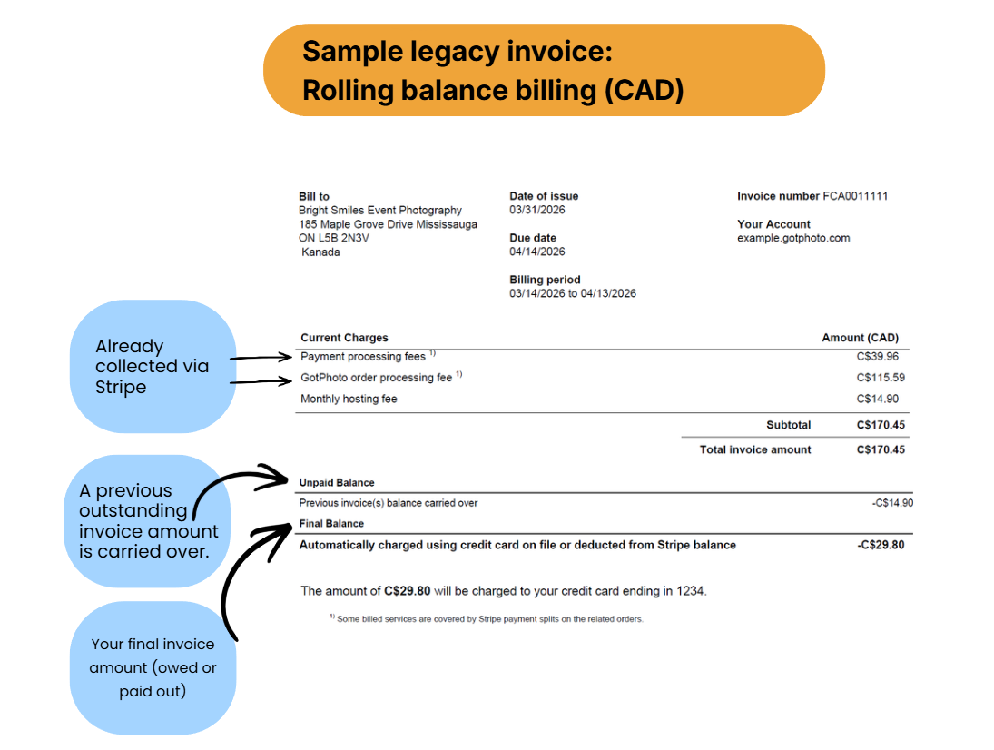 - The GotPhoto Balance is visible on your dashboard → Legacy (rolling balance) billing