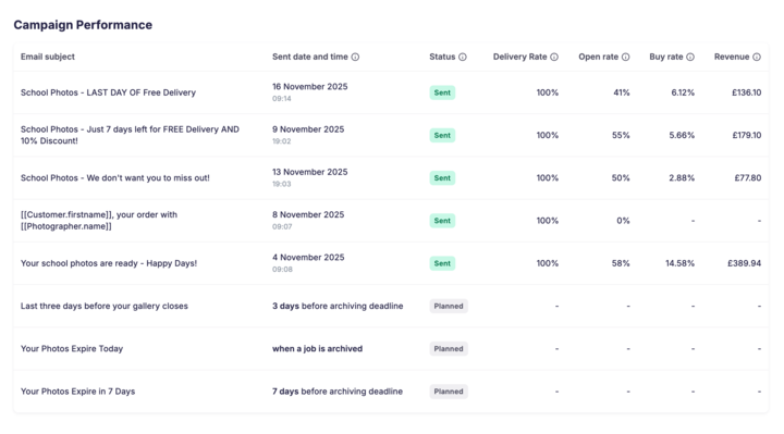 The campaign performance section is a new feature that offers key insights into your automated email campaigns. It displays delivery and open rates, along with each campaign’s current status. This allows you to quickly evaluate how well your automated emails are engaging recipients - all within the GotPhoto platform. You also gain visibility into the buy rate and the gross revenue generated through each notification.