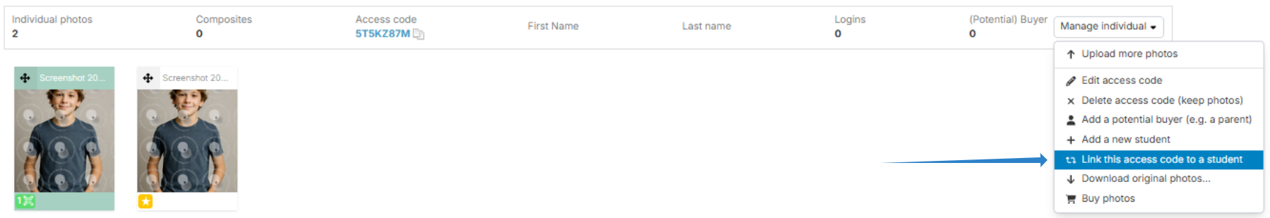 - After the access codes have been activated, locate the subject in Photo Management, and click on Manage individual -> Link this access code to a student.