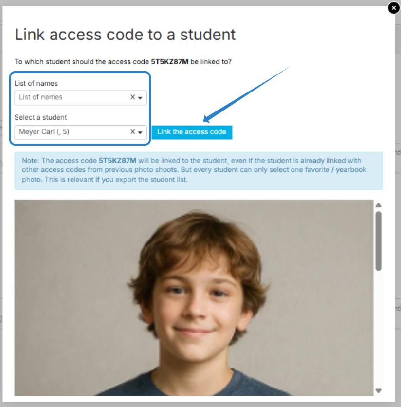 - Select the correct subject from the list of names or by entering the access code to a Select a student field. Confim by clicking on Link the access code.