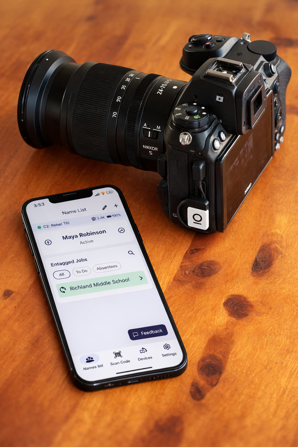You can switch to Name List QR whenever your Entagged device is disconnected. This allows you to access your job’s name list, select a subject, and photograph their digital QR code directly from the app.